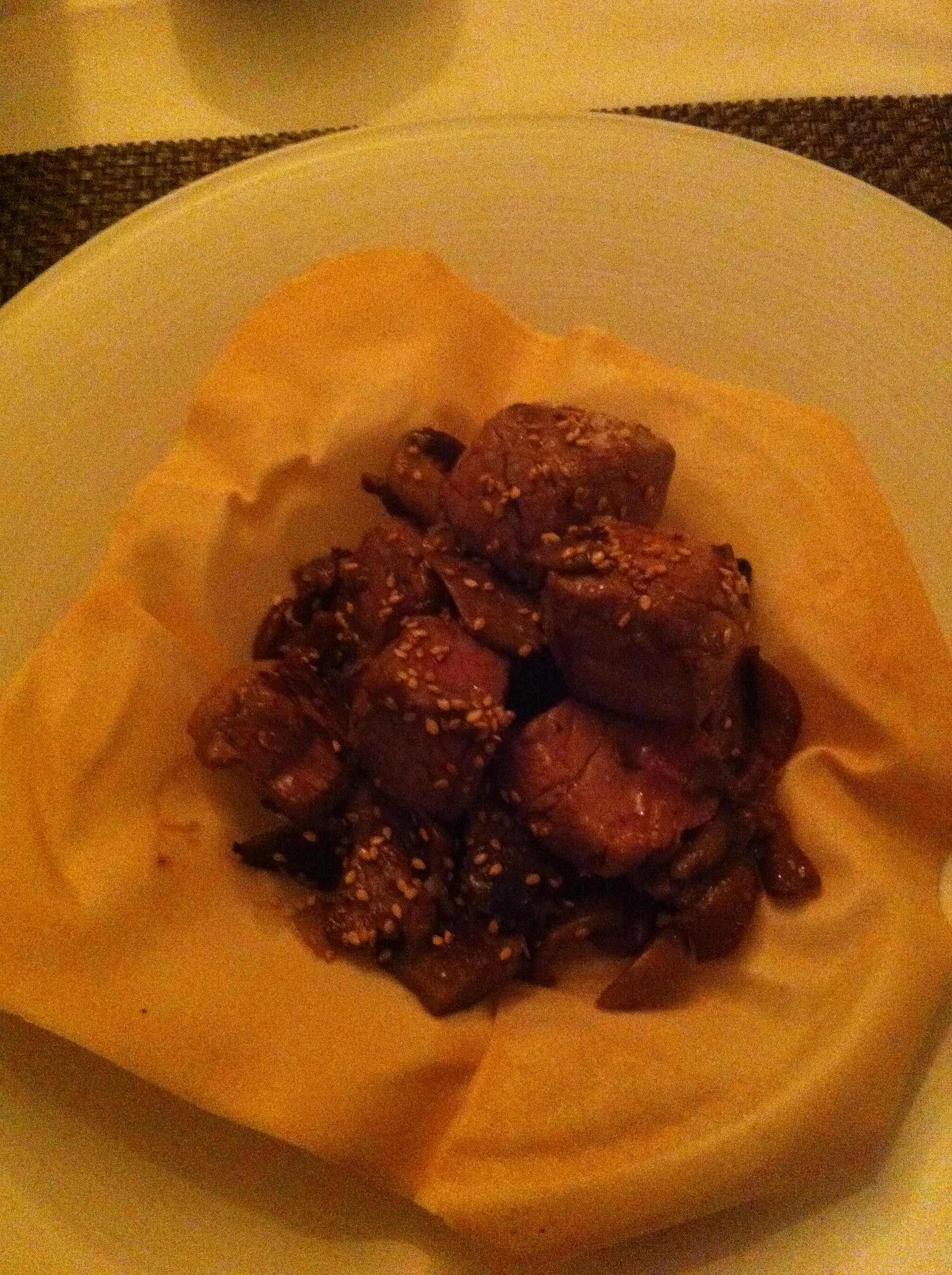 De plato principal, tomamos bacalao que estaba muy bueno, esto si que se notaba fresco y bien desalado. También tomamos dados de solomillo que eran normales, nada del otro mundo porque además a mi me parece que cuando un solomillo es bueno de verdad, hay que servirlo entero, no en dados, pero es una opinión personal.