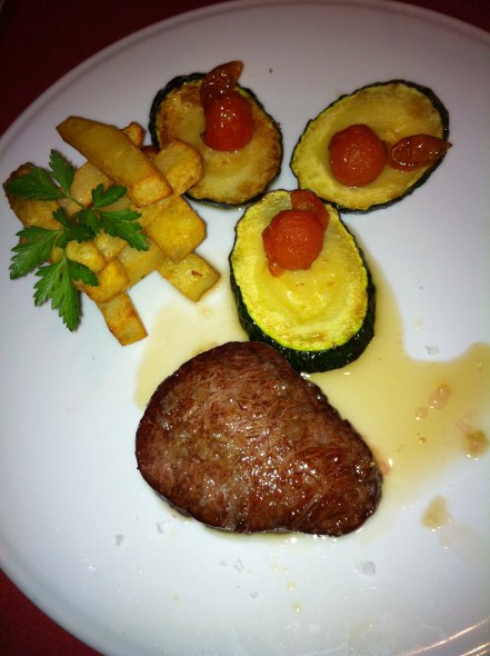 De plato principal, pedimos el solomillo de buey, que viene con patatas fritas y con calabacines y tomatitos cherry. La carne estaba bastante buena, ración media de cantidad y poco hecha, tal y como lo pedimos.