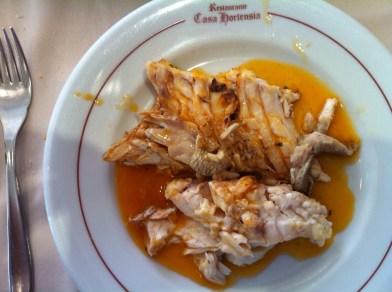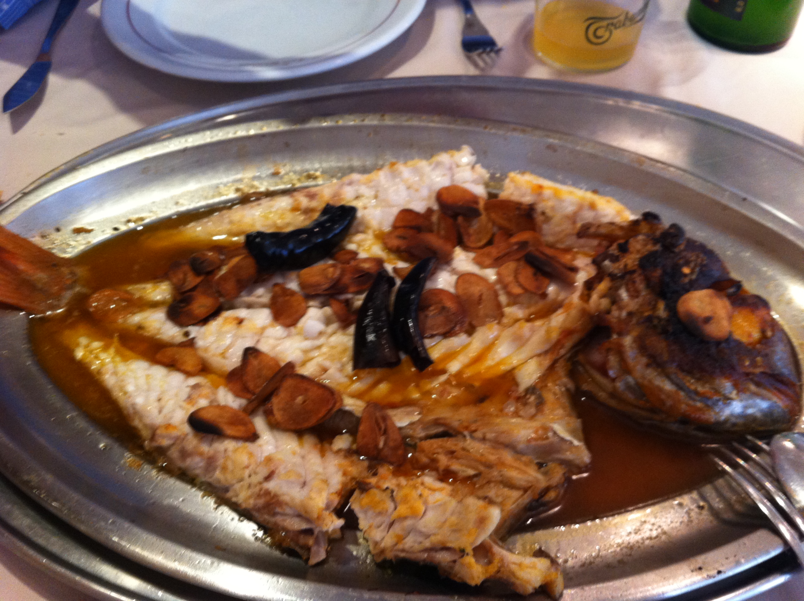 De segundo tomamos otra de las especialidades de la carta: besugo a la espalda. Riquísimo también. Te traen la bandeja entera con el besugo abierto y la salsa está riquísima. El pescado se nota fresco y súper bien cocinado, en su punto lo que le hace estar jugosísimo. Muy recomendable. De nuevo, la cantidad es brutal…