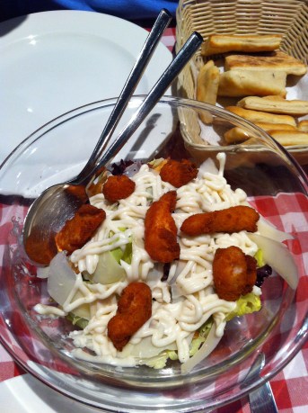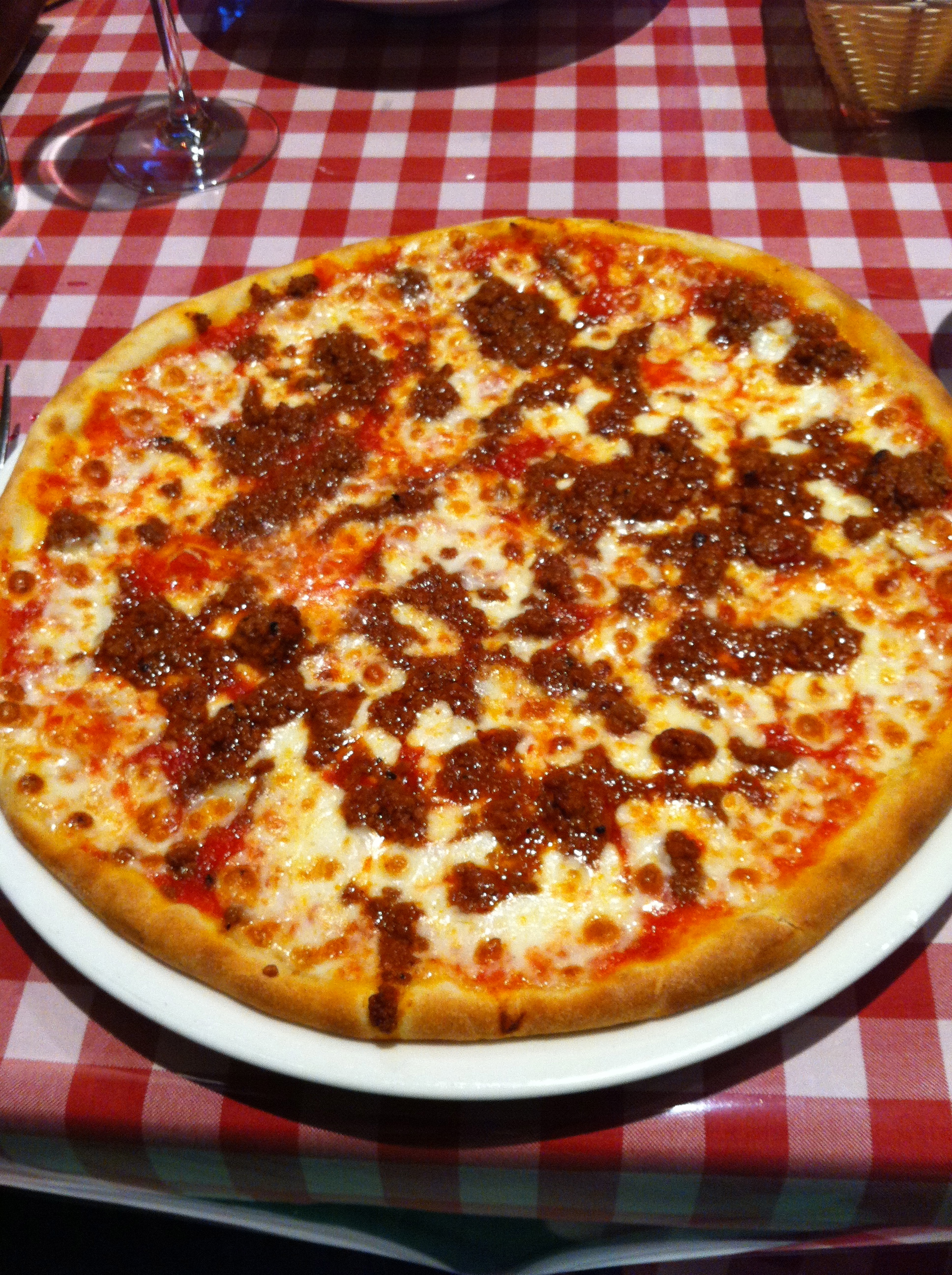 De platos principales, tomamos una pizza con salsa bolognesa. Esto fue lo mejor de la cena: como habíamos visto que todo tenía influencias americanas, pensábamos que sería la típica pizza de masa gorda, pero no, todo lo contrario, tenía una masa súper finita y la salsa bolognesa estaba muy rica.