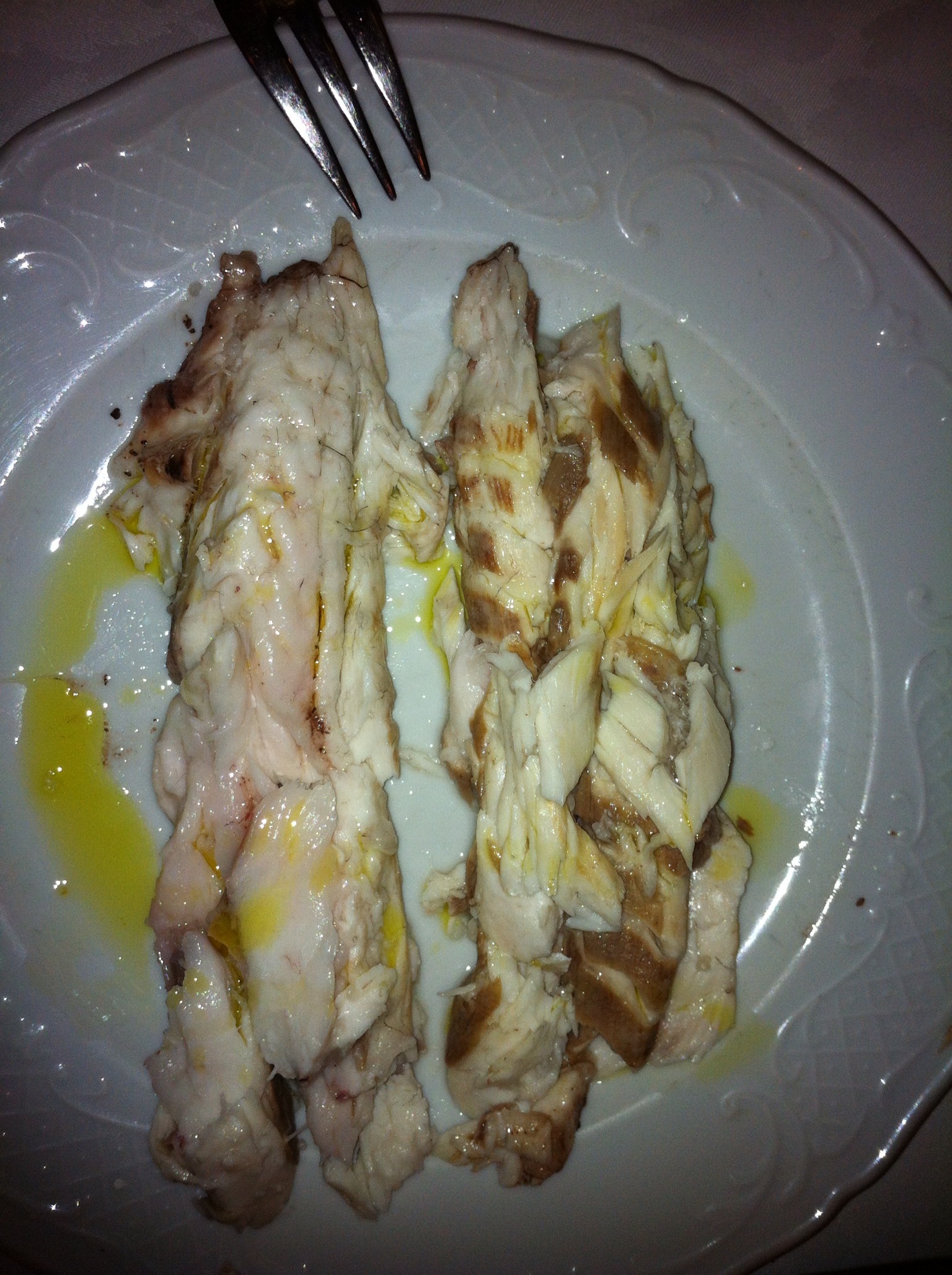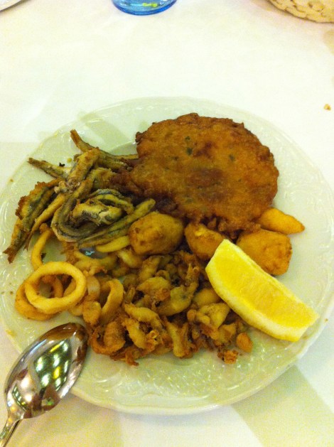 También pedimos una fritura variada porque además habíamos visto antes de ir en internet que mucha gente la recomendaba. Hombre, no está mal para ser Madrid, pero comparada con las del sur no tiene nada que ver. Tiene boquerones fritos, chopitos (puntillitas), una tortillita de camarón, adobo y calamares. Lo mejor el adobo. Los chopitos eran un poco pequeños y la tortillita estaba rica aunque un poco grasienta.