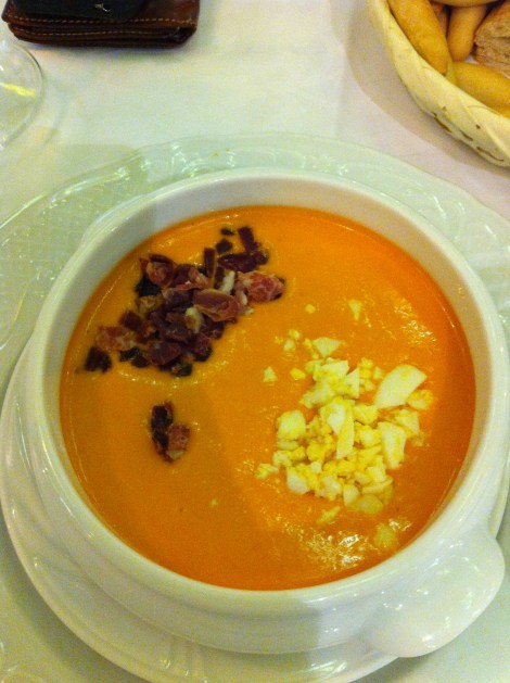 Platos típicos andaluces: los entrantes, pasando por carnes y pescados e incluyendo también arroces variados. Para empezar pedimos una ración de salmorejo para compartir. Estaba bien pero yo creo que le pondría más vinagre, aunque es una opinión muy personal porque a mi me gusta fuerte. Venía con un chorrito de aceite de oliva y un poco de jamón picado.