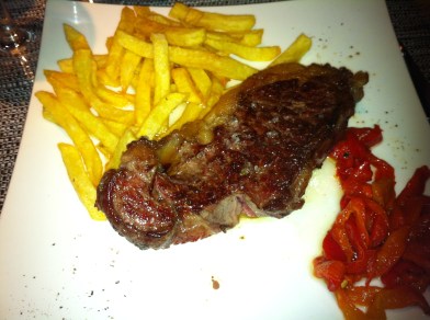 Y de carne, tomamos el lomo de buey gallego. Viene con patatas fritas y pimientos rojos asados y la carne está muy rica, tierna, poco hecha y con mucho sabor. Muy recomendable.