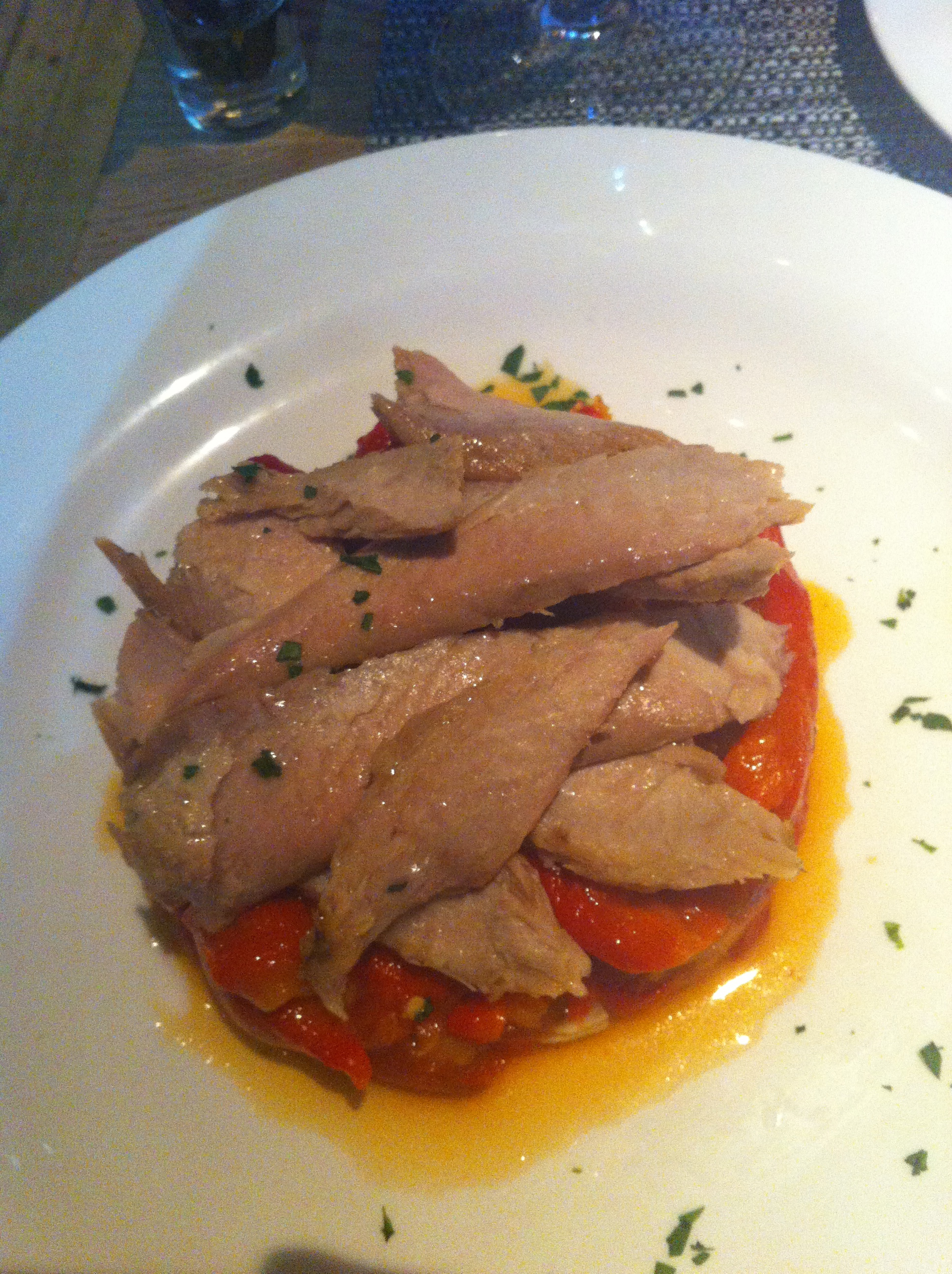 La carta es bastante variada, con platos españoles y comida mediterránea. De entrante pedimos la provoletta que está muy buena. Bien cocinada y tierna, no es la típica que a los 2 minutos se ha quedado chiclosa… Y para compartir, la ensalada de pimientos asados, ventresca y cebolleta. La ración es bastante abundante, para mi gusto le falta vinagre de módena o algo así que le dé un toque un poco más fuerte.