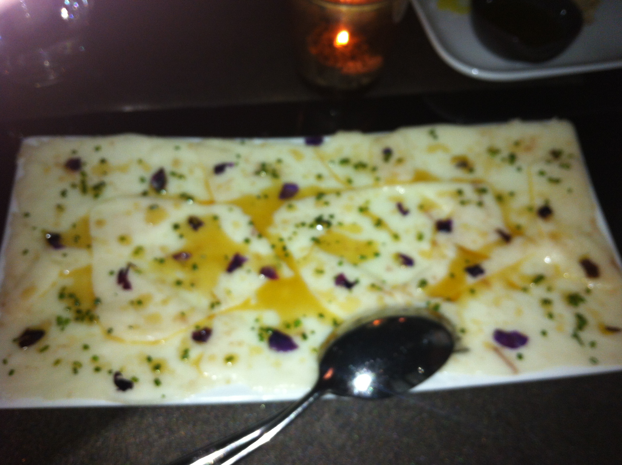 La carta tiene mezcla de platos clásicos con algunos toques más modernos e incluso algunos platos con influencia asiática. Para compartir pedimos carpaccio de pez mantequilla. Viene muy finito y con un aceite de sésamos que le da un sabor distinto aunque yo creo que le deberían poner menos cantidad para que quede más suave y se pueda apreciar más el pescado.
