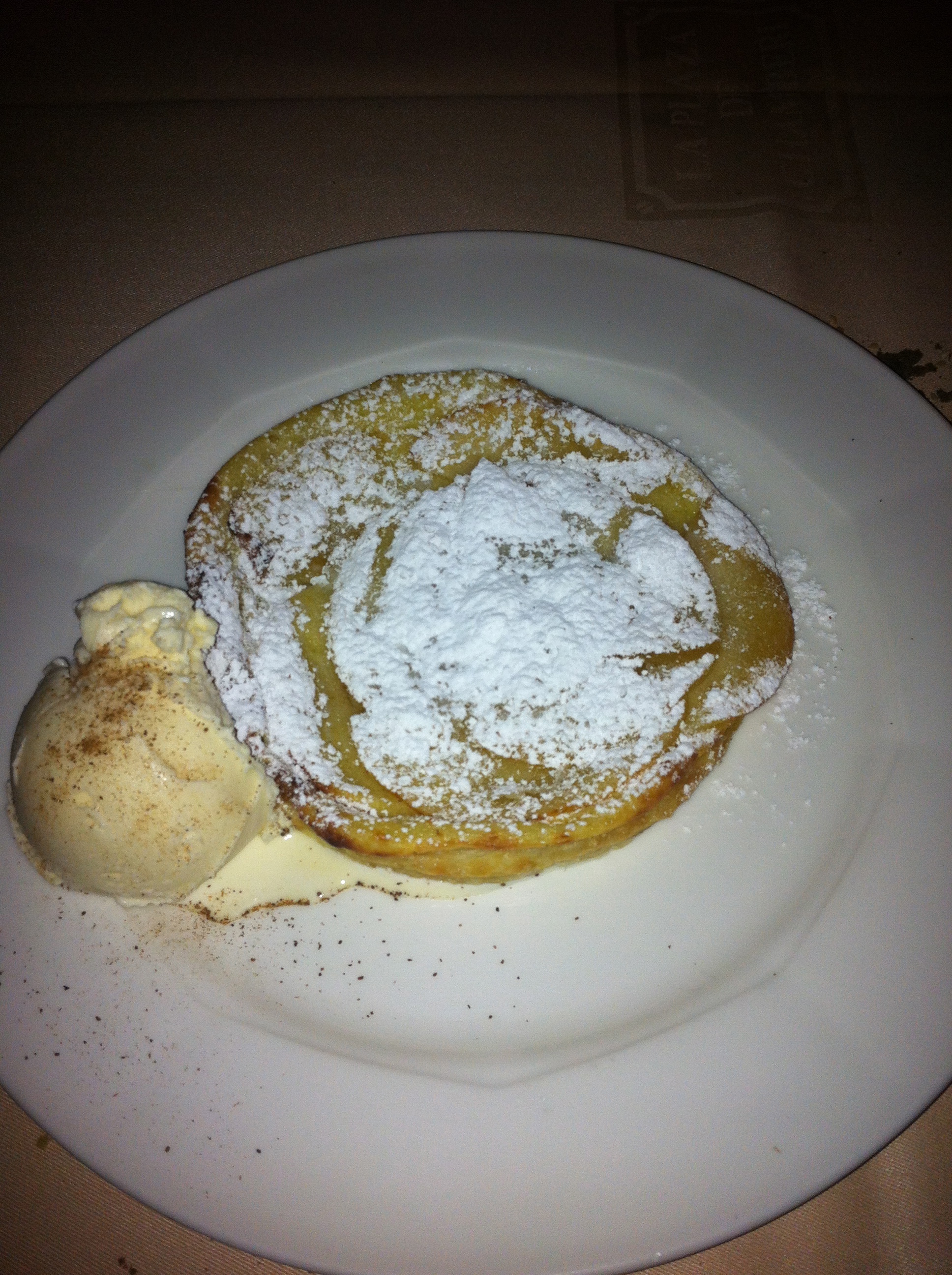 Y de postre tomamos la tarta de manzana, que la incluyen en la carta como una de las especialidades y además hay que pedirla con tiempo porque tardan unos 20 minutos. Y realmente merece la pena probarla, es con un hojaldre muy fino y una ligera crema pastelera. Viene caliente.