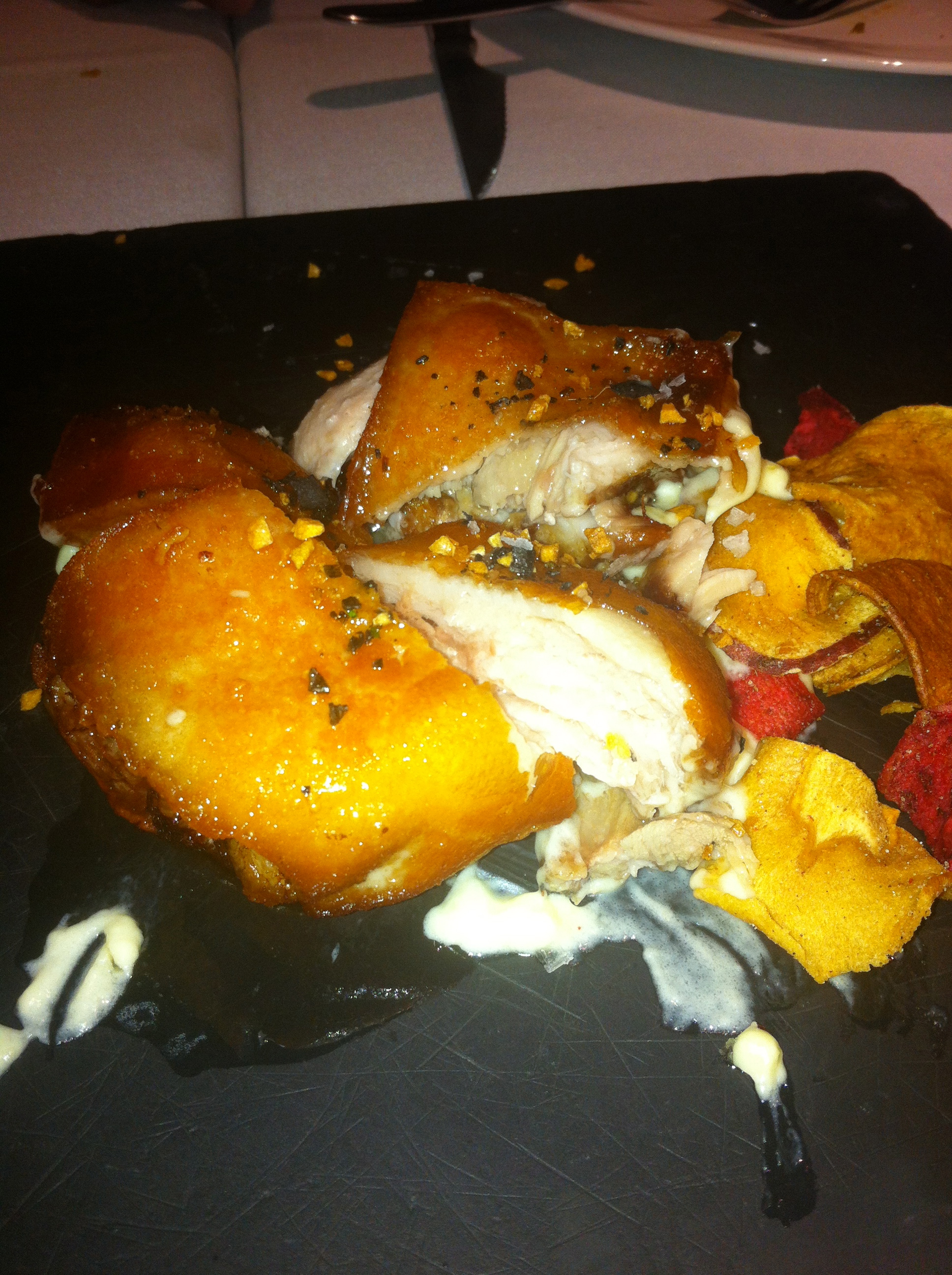 Continuamos con el cochinillo confitado con aroma de trufa. Quizá el mejor plato, súper tierno, con la patata acompañando. A mi no me gusta especialmente el cochinillo pero varias personas del grupo les encanta y quedaron impresionados con este.