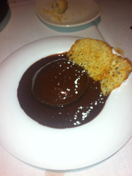De postre, pedimos para compartir el coulant de chocolate, que viene totalmente bañado en chocolate caliente pero a mi me pareció demasiado intenso y le faltaba estar un poco más líquido por dentro.