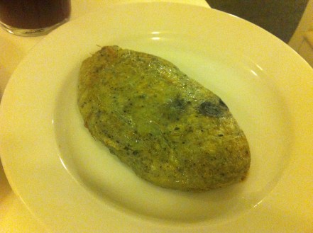 Como su propio nombre indica, la especialidad son las tortillas. Las tienen de todo tipo: verduras, patatas, con salsas, etc. La carta la podéis consultar aquí. Nosotros pedimos dos tortillas para probar, la primera de trufa y queso (13€) que habíamos leído que tenía muy buena fama. Es una tortilla francesa, con queso y un aspecto algo artificial. A mi me decepcionó mucho, se salvó porque tiene mucho sabor a trufa, que si que es verdad que ahora en muchos sitios te dicen que algo lleva trufa y no tiene ni aroma pero no es el caso. Yo la verdad es que esta tortilla la haría con patata o algo así. Me recordaba en parte a la comida preparada de los aviones.