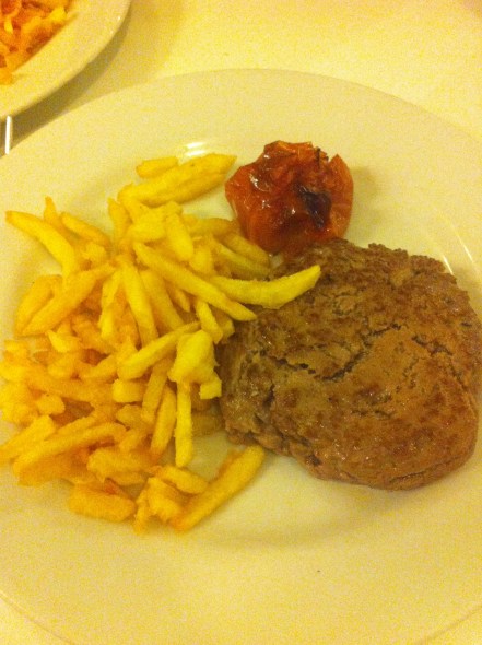 Para seguir tomamos una hamburguesa Monty (13,70€) cada uno ya que es otra de las especialidades que recomendaban. Viene sin pan y trae patatas fritas bastante caseras. La pedimos poco hecha y viene así pero de nuevo nos pareció muy normal, nada destacable, de hecho la propia presentación del plato no es nada atractiva.