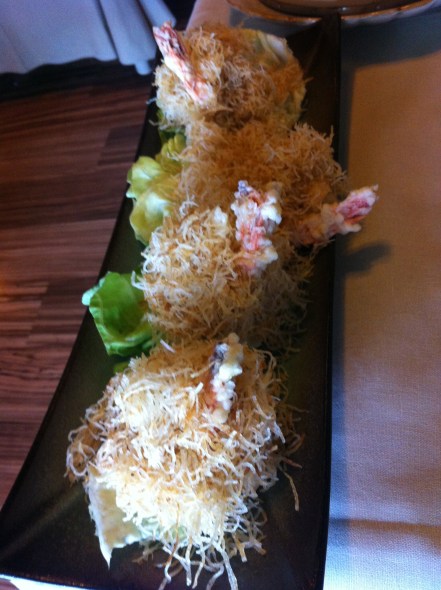 También pedimos de entrante los langostinos crujientes sobre nido de patata (15,50€). Este plato no merece mucho la pena porque lleva mucha salsa y sobre todo muchísimas patatas paja, apenas se nota el langostino con tanto aderezo…. Vienen 4 langostinos, bastante abundante, llena mucho.