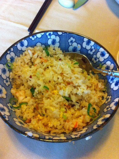 De plato principal para dos pedimos el pato laqueado, medio (35€). Lo preparan los camareros en crepes y lo sirven hecho. Traen en total 8 crepes. Está muy bueno, la piel del pato es muy crujiente y tiene un poco de carne que queda muy tierna. Yo quizá le quitaría un poco de salsa en la preparación del crepe. De acompañamiento arroz con verduras y gambas para compartir (8,50€).