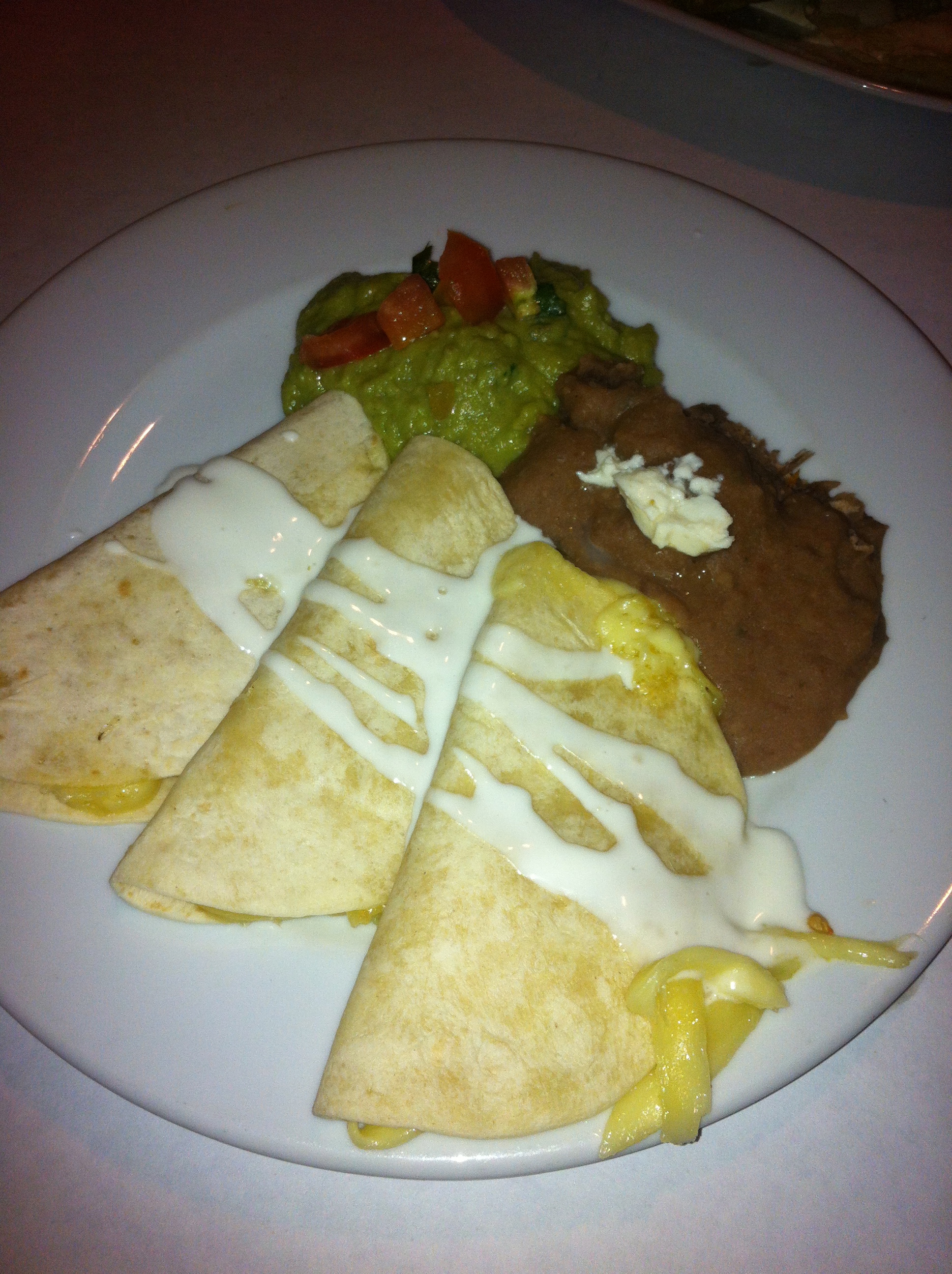 Carta típica de un restaurante mejicano: nachos, quesadillas, tacos, fajitas, etc. Nosotros pedimos de entrante unas quesadillas Si Señor (6,95€). Son sólo con queso por dentro y acompañadas de guacamole. Normales, un pelín sosas.