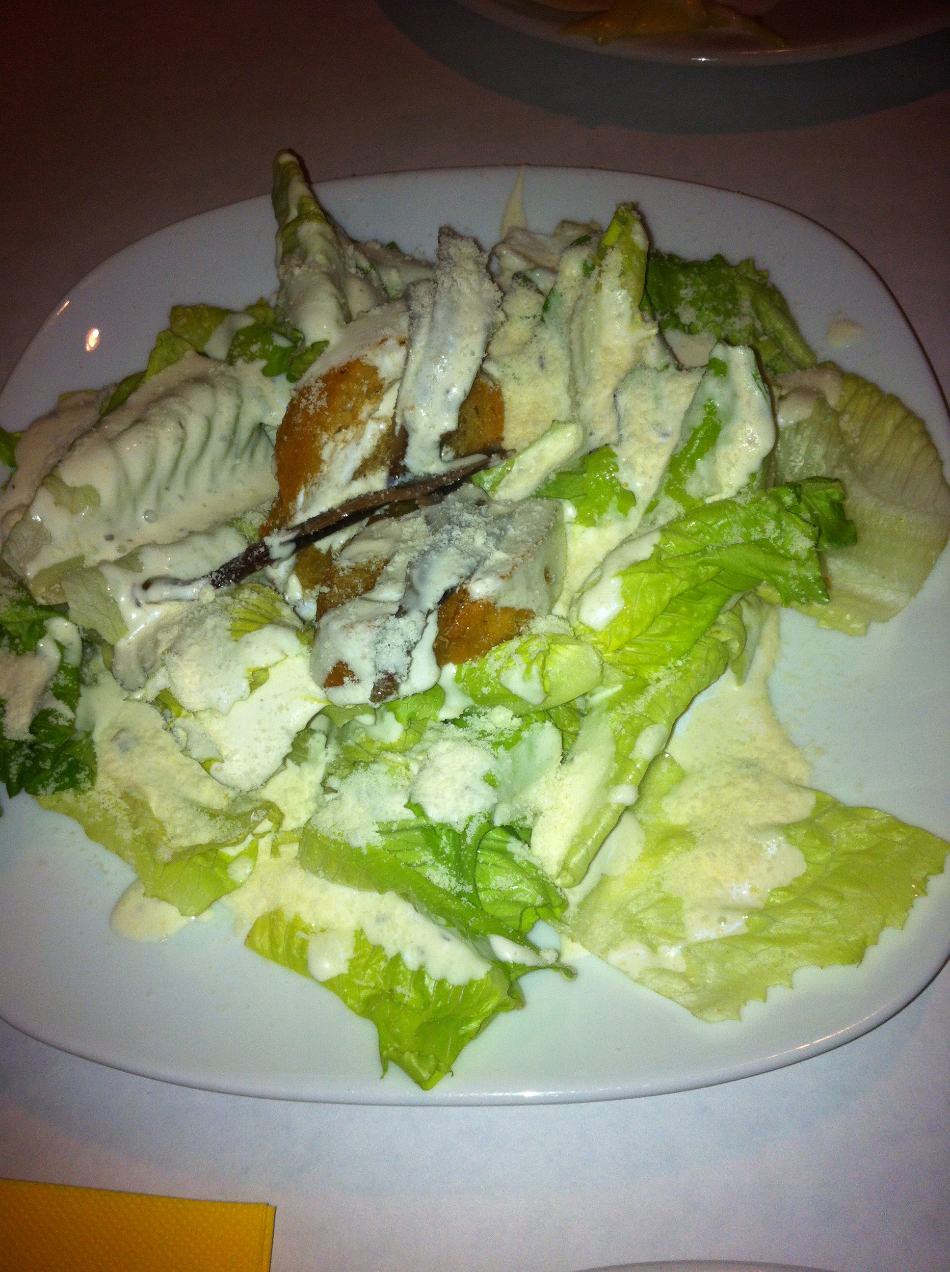 Pedimos también la ensalada césar sin pollo (6,55€). Trae dos anchoas, trozos de croutons y lechuga pero la salsa es muy fuerte, no nos gustó mucho.