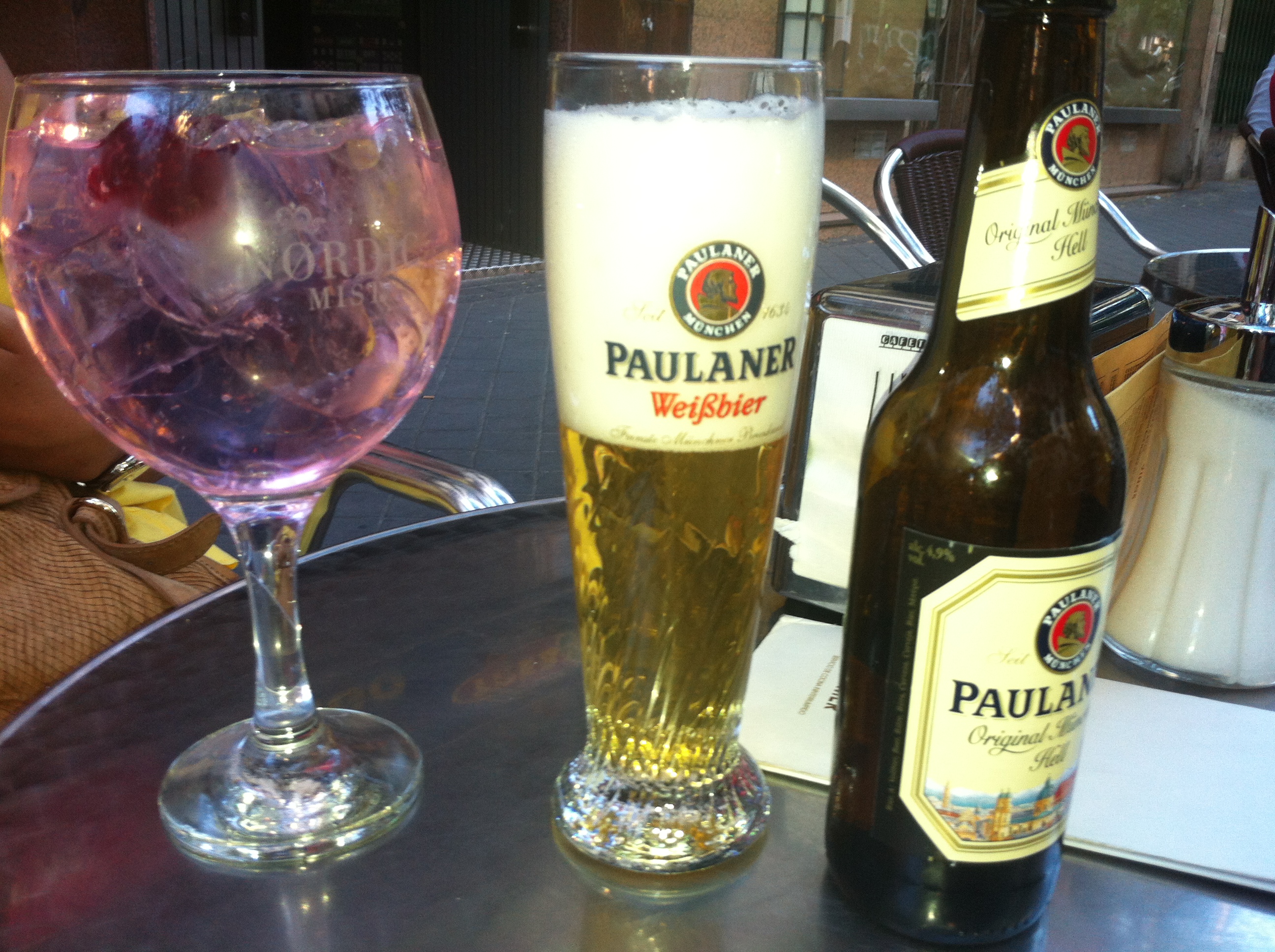 Después, pedimos un gin tonic Brockman’s 40º que viene con frambuesas (10,45€). Lo preparan en copa de balón y está muy bueno. También pedimos una cerveza Paulaner Salvator en botella (3,41€), súper típica en Alemania pero no tan fácil de encontrar en Madrid.