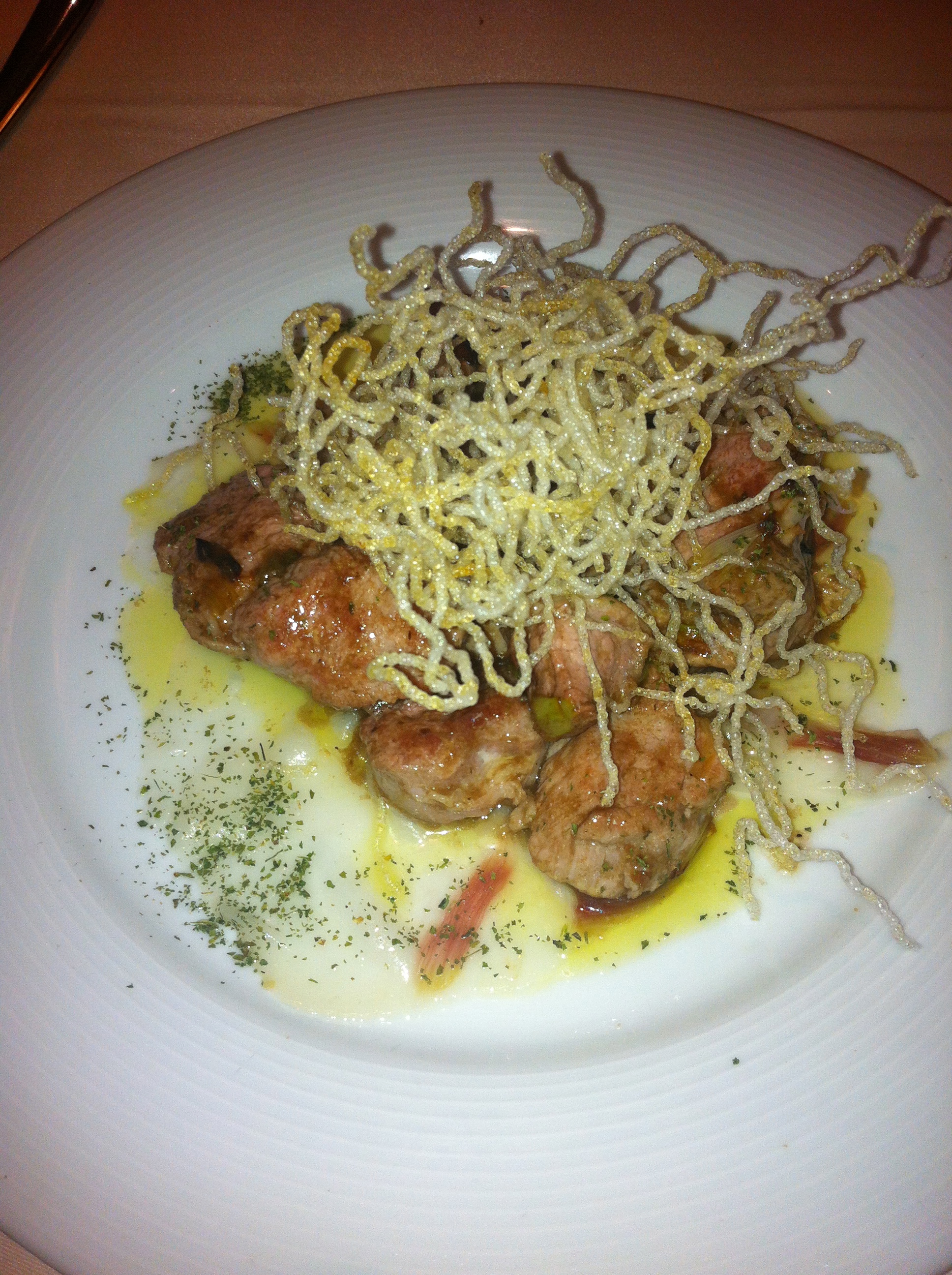 De plato principal pedimos las milhojas de vieiras y berenjenas con trigueros salteados (17,20€). Es el plato que más nos gustó. Ponen 3 vieiras grandes y muy tiernas y las berenjenas cortadas finitas envolviéndolas.