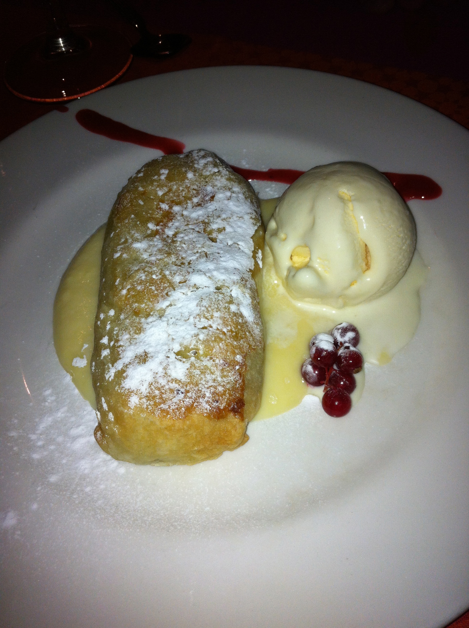 Y de postre, que es otra de las especialidades que no queríamos dejar de tomar, pedimos el Apfelstrüdel (5,50€). Y nos decepcionó un poco, porque íbamos con unas expectativas muy altas y encima este verano aprendí a hacerlo yo misma así que lo valoro mucho más. Es que yo creo que esta vez no estaba recién hecho, porque estaba frío cuando este postre hay que servirlo caliente con helado y además la masa era un hojaldre mucho más pesado que la masa quebrada que queda crujiente y es uno de los fuertes de este postre.