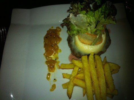 Y por último probamos la hamburguesa de solomillo (20€). Muy rica, la pedimos con queso de cabra que es un pelín fuerte pero está muy buena. Nos gustó más incluso que el steak tartar.
