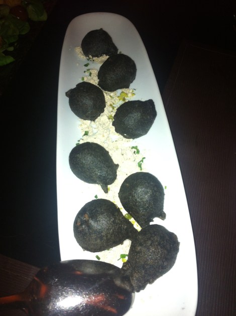 Tienen una carta muy original, con platos muy apetecibles. Pedimos para empezar los buñuelos de trufa (16€). Nos pareció un plato original, son buñuelitos negros con un poco de sabor a trufa y están muy buenos porque no son grasientos.