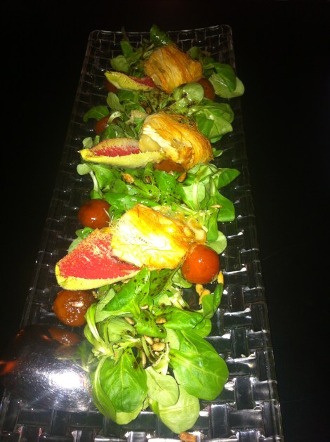 También tomamos el queso brie frito (12€), que pensábamos que serían trozos más pequeños pero en realidad es como una ensalada con grandes trozos de queso brie envuelto en tiras como de pan. Está bueno pero es muy abundante y por eso un poco pesado.