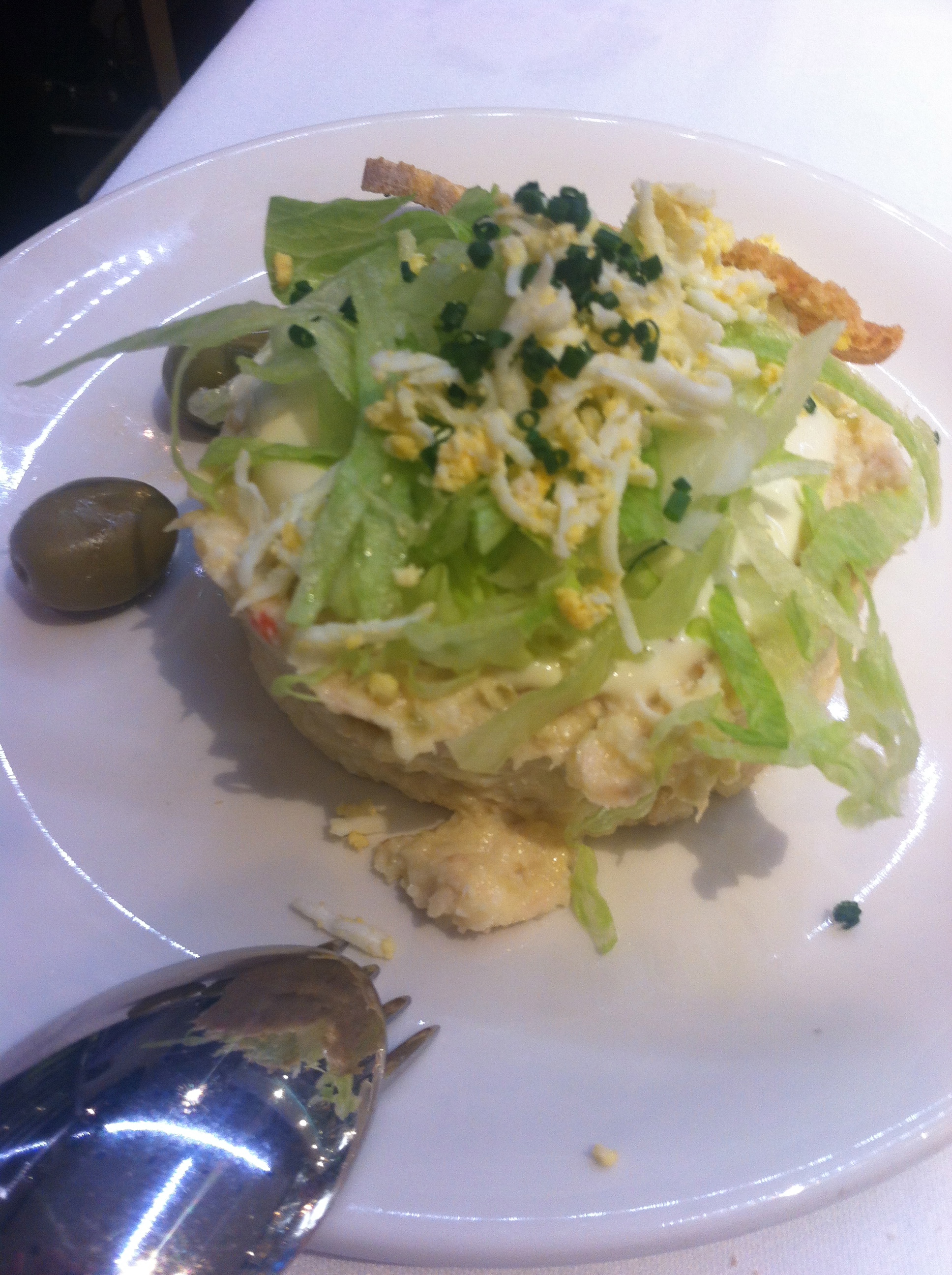 Carta con platos típicos españoles: salmorejo, boquerones fritos, embutidos, etc. Nosotros pedimos para compartir. Primero probamos media ración de ensaladilla rusa (5,20€). Estaba buena pero la mayonesa demasiado ligera, como un poco acuada.