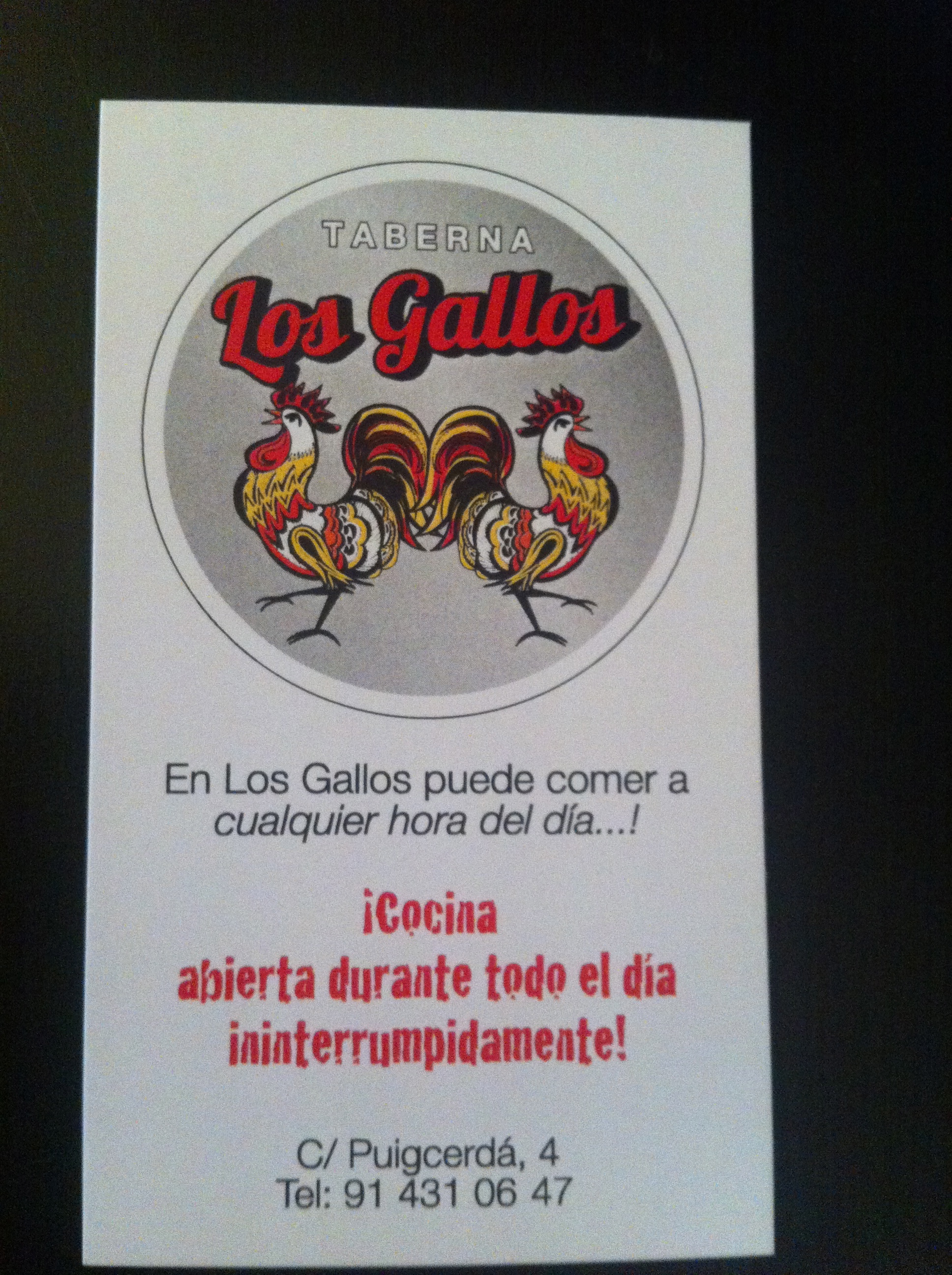Está en el callejón de Jorge Juan, rodeado de un montón de restaurantes con un ambiente de gente con una media de 35 – 40 años. Los Gallos es uno de los edificios con unas 3 plantas. En la baja tienen terraza e interior y arriba del todo hay otra terraza que me habían recomendado para ir a tomar una copa por la noche. Nosotros estuvimos en el interior en la planta baja que tienen como mesas altas con banquetas que son bastante cómodas.