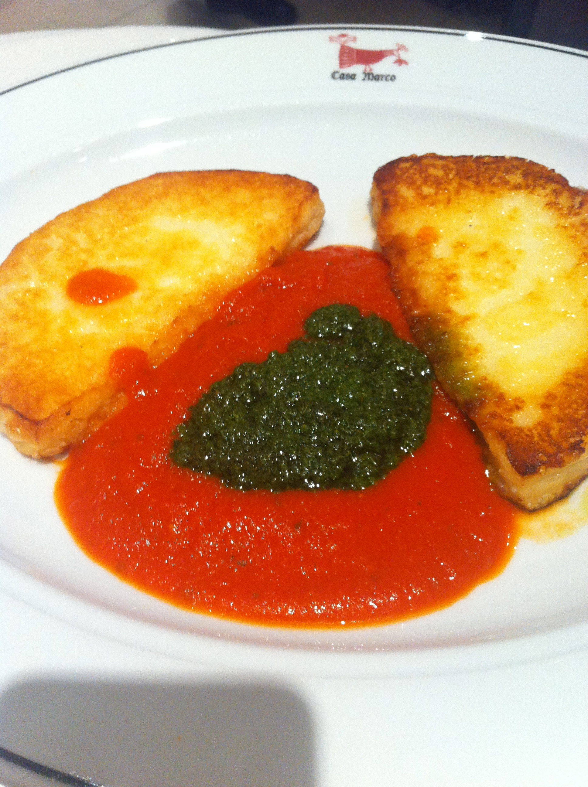 Carta típica italiana con platos muy apetecibles. Se puede consultar aquí. Pedimos para empezar un queso provola con salsa de tomate y pesto (12,50€). Viene partido en dos trozos y está rico aunque a mi me gusta un poco más derretido.