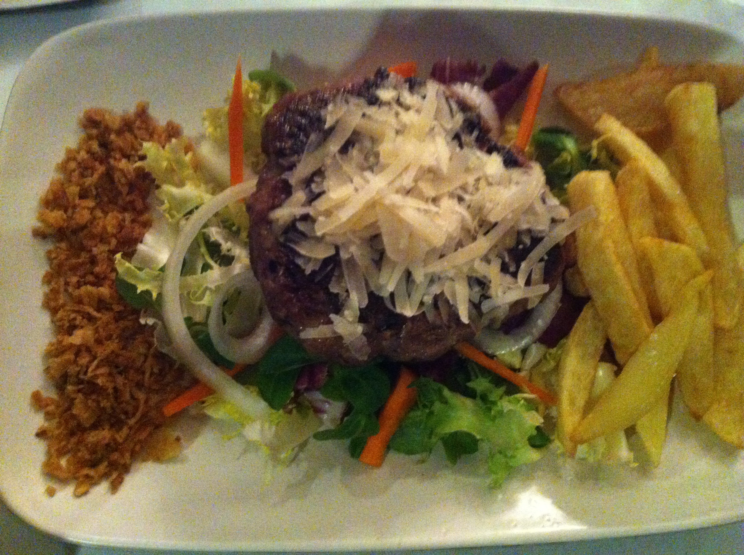 Y el otro plato principal fue la gastro-hamburguesa artesana Sunset (8€). Viene sin pan y con patatas, lechuga y cebolla frita de acompañamiento. La verdad, con ese nombre espérabamos una carne más tierna y sabrosa.