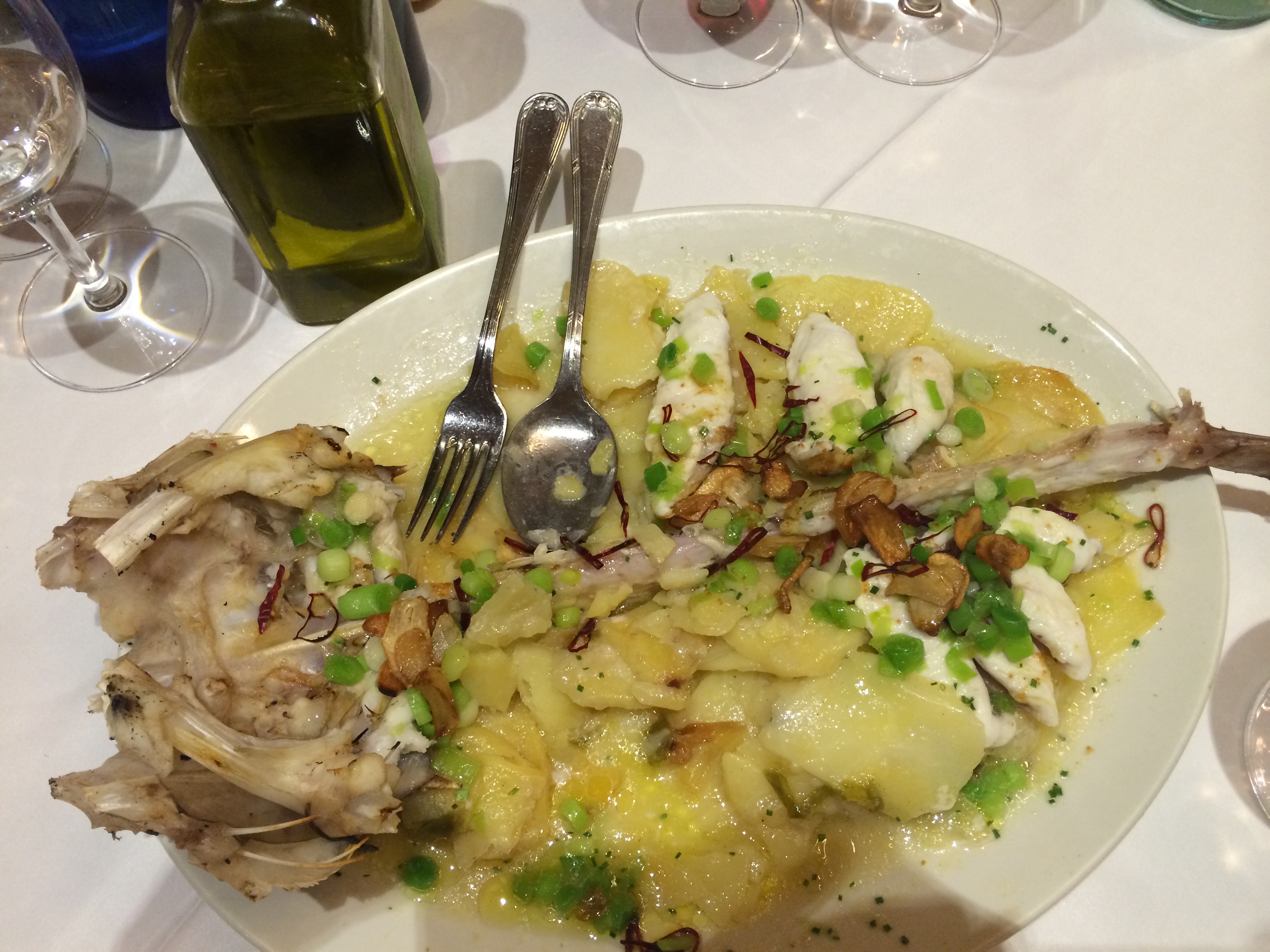 De platos principales, para dos pedimos el rodaballo asado a la brasa, caldo de su espina y ajada (32€). Es una cantidad enorme porque ponen el rodaballo entero, está muy bueno aunque yo no pondría tantísimas patatas por debajo.