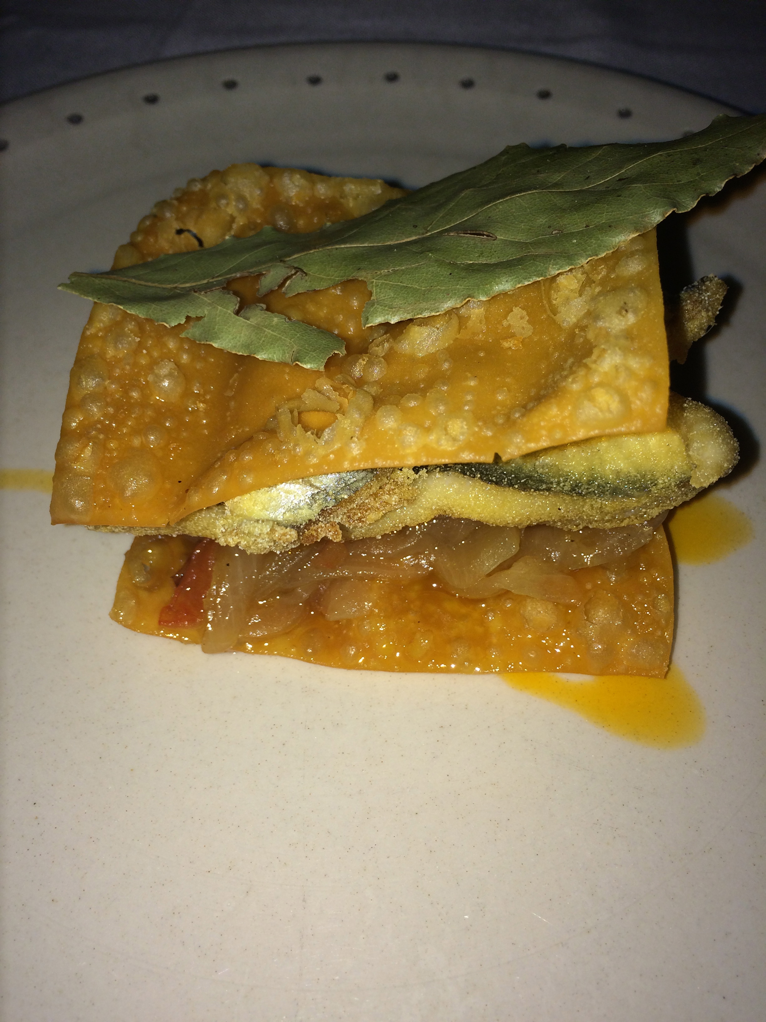 Para empezar compartimos las milhojas de xoubas, están exquisitas, súper original, la masa es como frita pero sin mucha grasa y el relleno de xoubas muy sabroso.