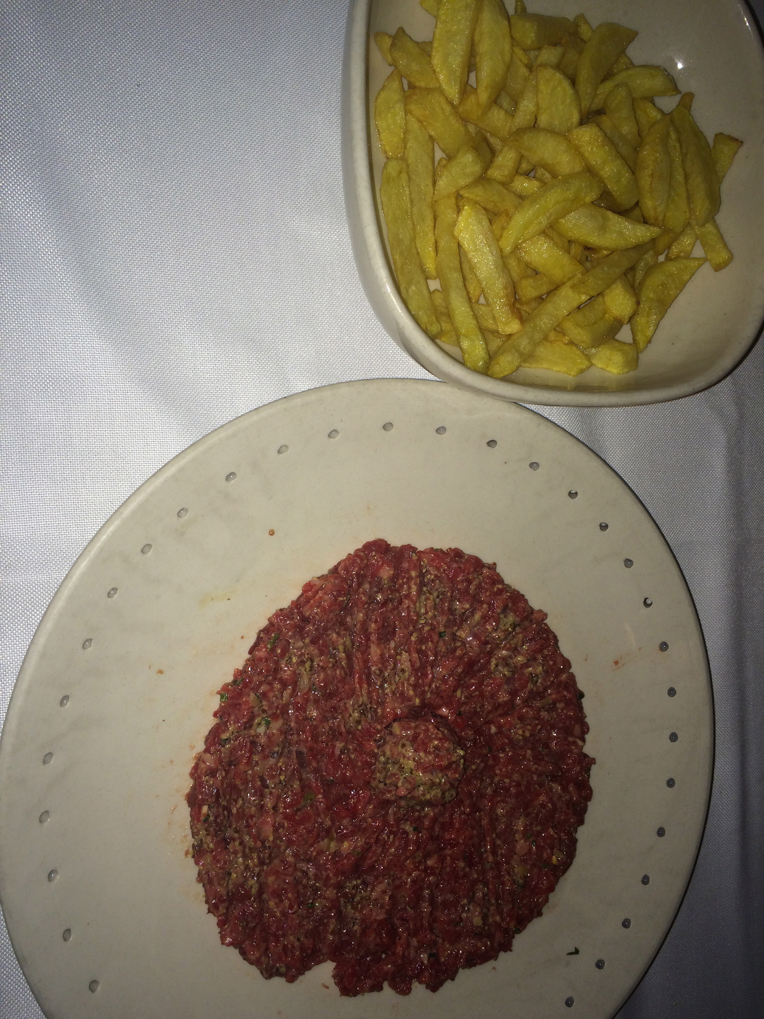 También probamos el steack tartar que está muy rico pero la verdad es que no nos gustó la presentación porque lo traen como aplastado. Viene acompañado de patatas fritas.